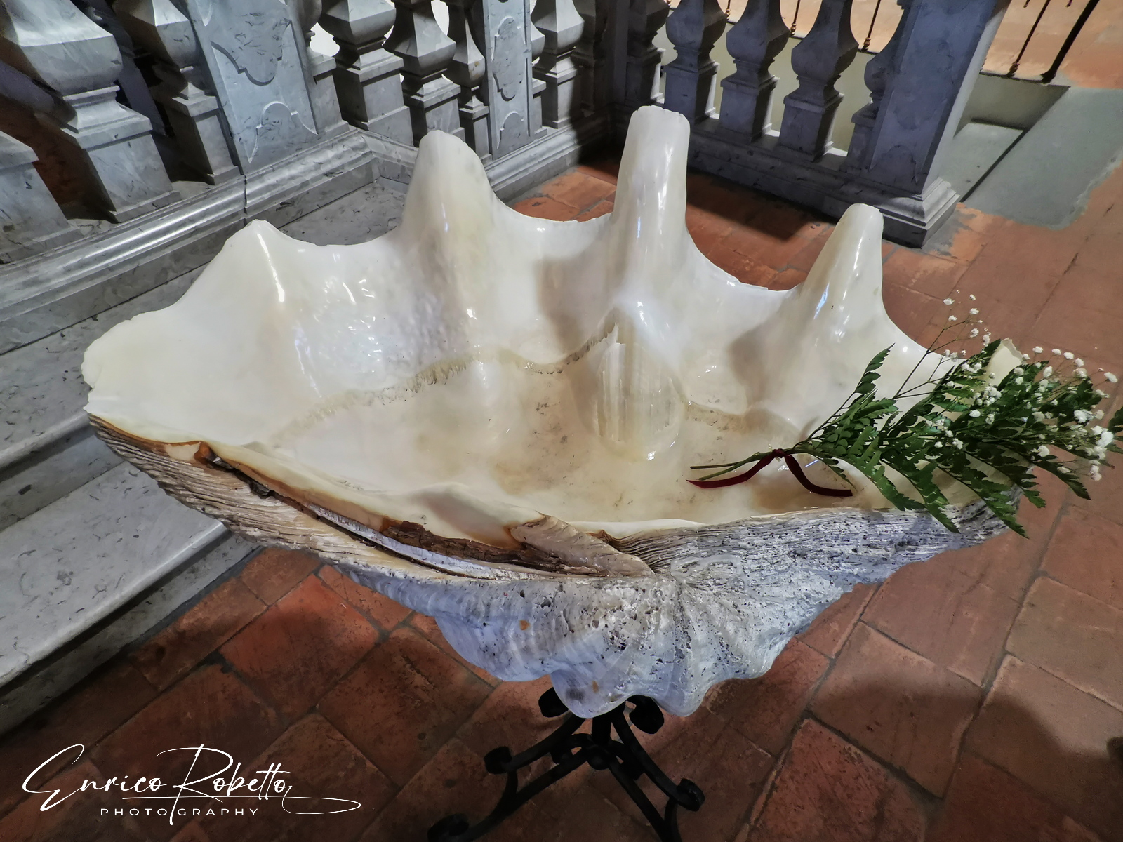 Bobbio, Piazza San Colombano, interno dell' Abbazia di San Colombano, VIII Secolo, Acquasantiera con un guscio di Tridacna, Piacenza, Italia ----- Bobbio, San Colombano Square, interior of the Abbey of San Colombano, 8th Century, Holy Water Stoup with a Tridacna Shell, Piacenza, Italy