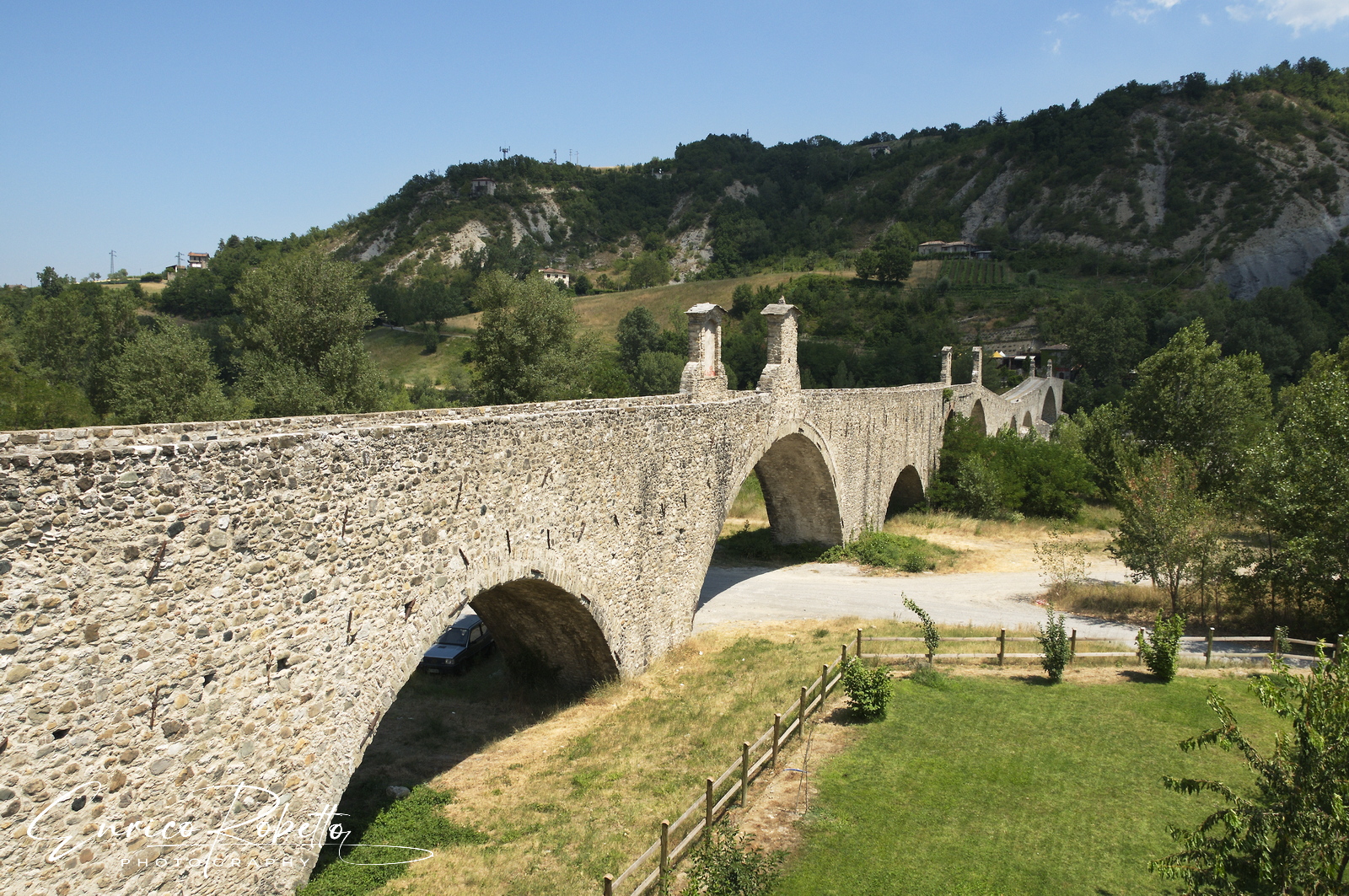 Bobbio, Il Ponte Gobbo sul Fiume Trebbia, costruito nel XII Secolo su una base risalente al VII Secolo, Piacenza, Italia ----- Bobbio, the Bridge called Gobbo (Hunchback) over the River Trebbia, built in the XIIth Century on a seventeenth-century base, Piacenza, Italy
