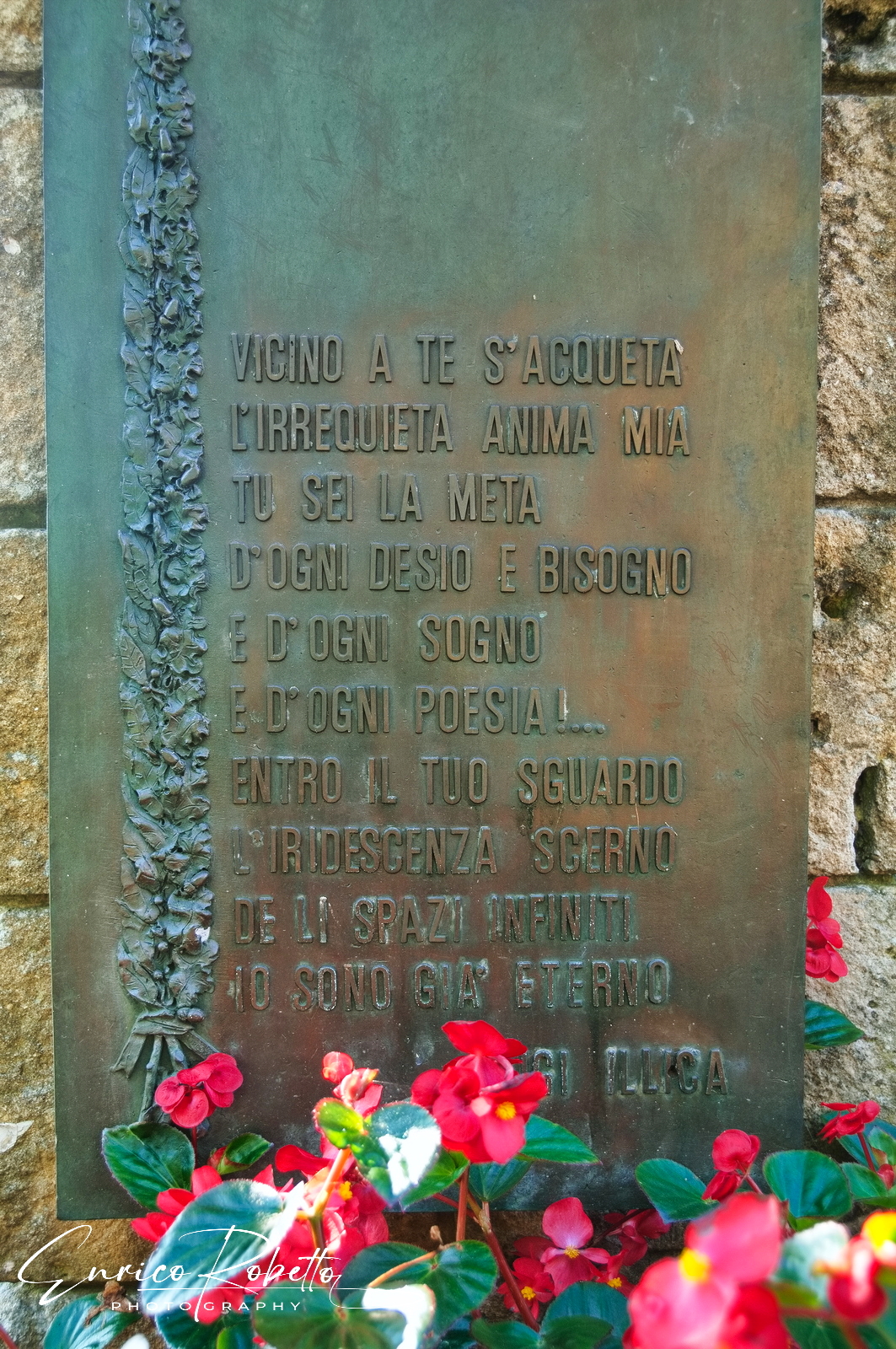 Castell'Arquato, Giardini della Rocca Viscontea, intitolati a Papa Giovanni Paolo II, lapide dedicata al Poeta Luigi Illica, Piacenza, Italia ----- Castell'Arquato, the Gardens of the Rocca Viscontea, dedicated to Pope John Paul II, Piacenza, Italy, plaque dedicated to the poet Luigi Illica, which says ""Near you my restless soul sharpens, you are the goal of every desire and need and of every dream and of every poem! ... within your gaze I discern the iridescence of infinite spaces I am already eternal""