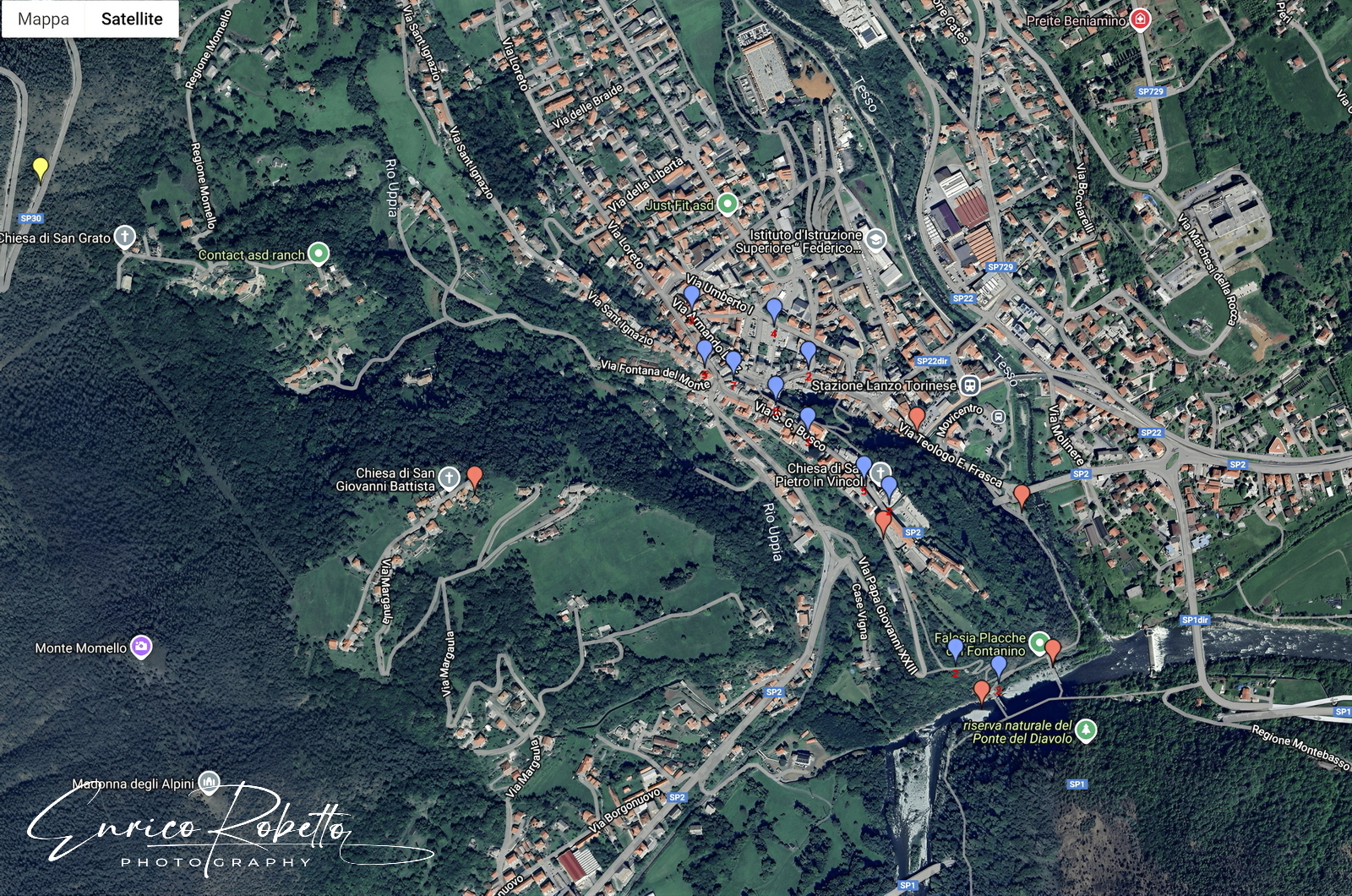 Lanzo Torinese dal satellite, i punti rosso blu e gialli indicano dove ho scattato le foto ----- Lanzo Torinese from Satelite, the red, blue and yellow dots indicate where I took the photos