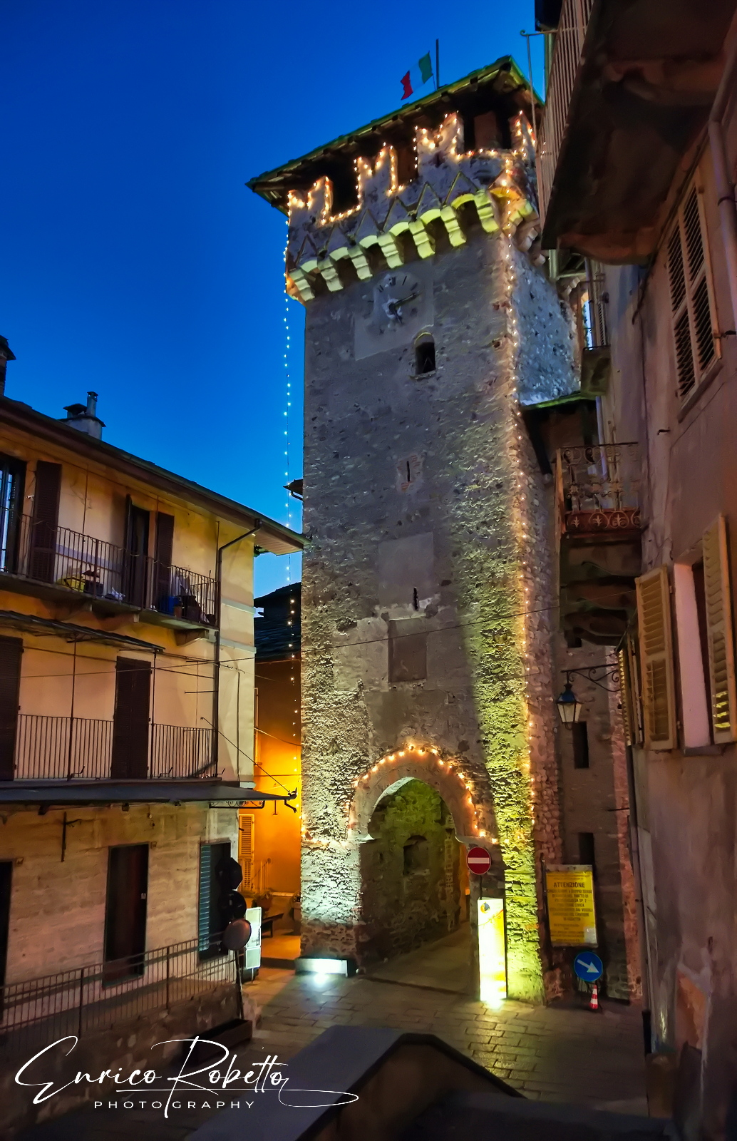 Lanzo Torinese, la Torre di Aymone di Challant, XIII Secolo vista in notturna da Via Sant'Ignazio, Torino, Italia ----- Lanzo Torinese, the Tower of Aymone di Challant, 13th Century seen at night from Via Sant'Ignazio, Turin, Italy