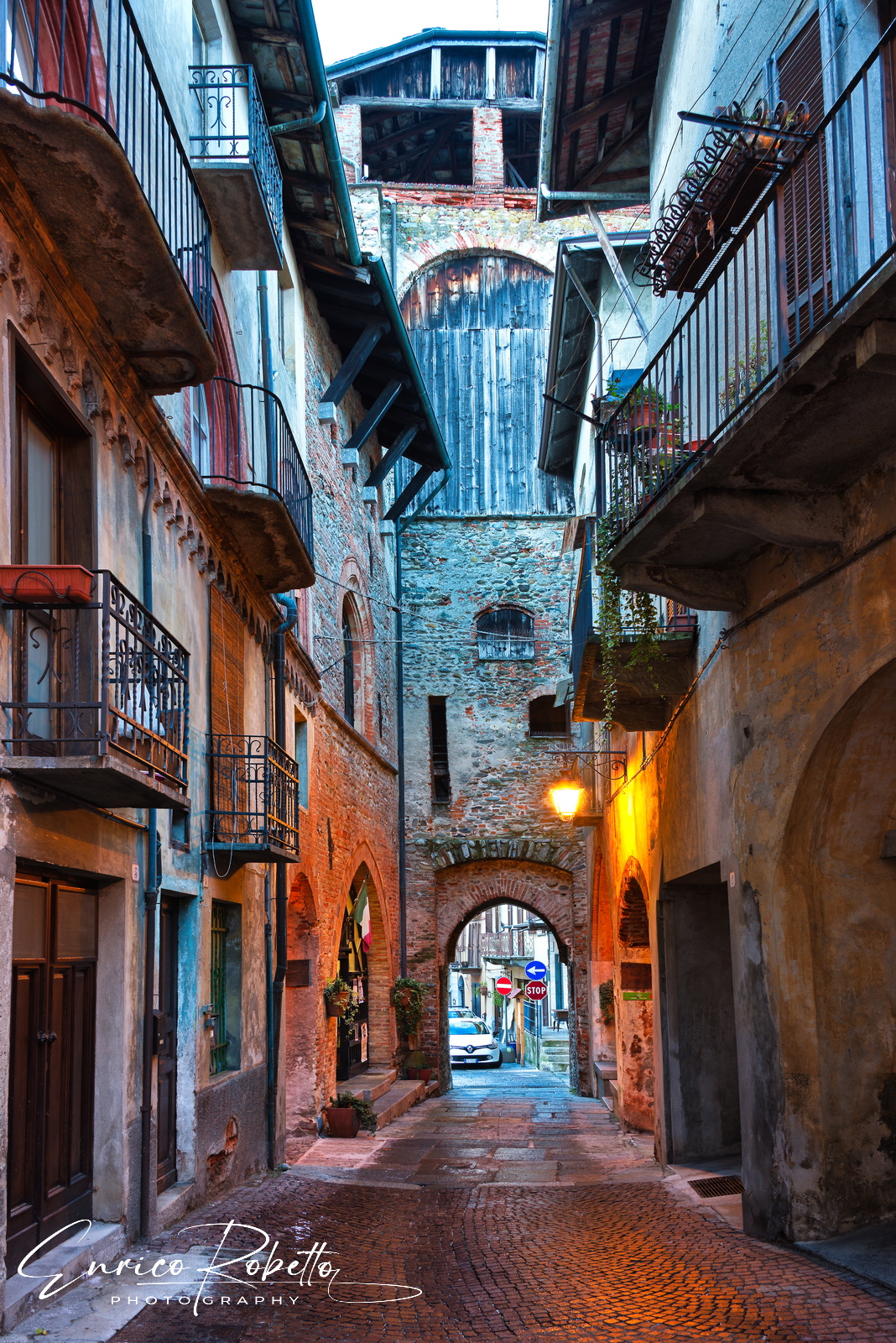 Lanzo Torinese, Via San Giovanni Bosco, la Torre Aymone di Challant, XIII Secolo,Torino, Italia ----- Lanzo Torinese, San Giovanni Bosco Street, the Tower Aymone of Challant, XIII Century, Turin, Italy
