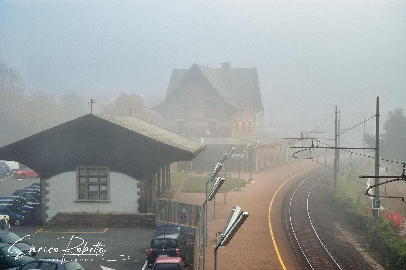 Lanzo Torinese, la Stazione Ferroviaria di Lanzo Torinese nella nebbia, Torino, Italia ----- Lanzo Torinese, Railway Station in the fog, Turin, Italy