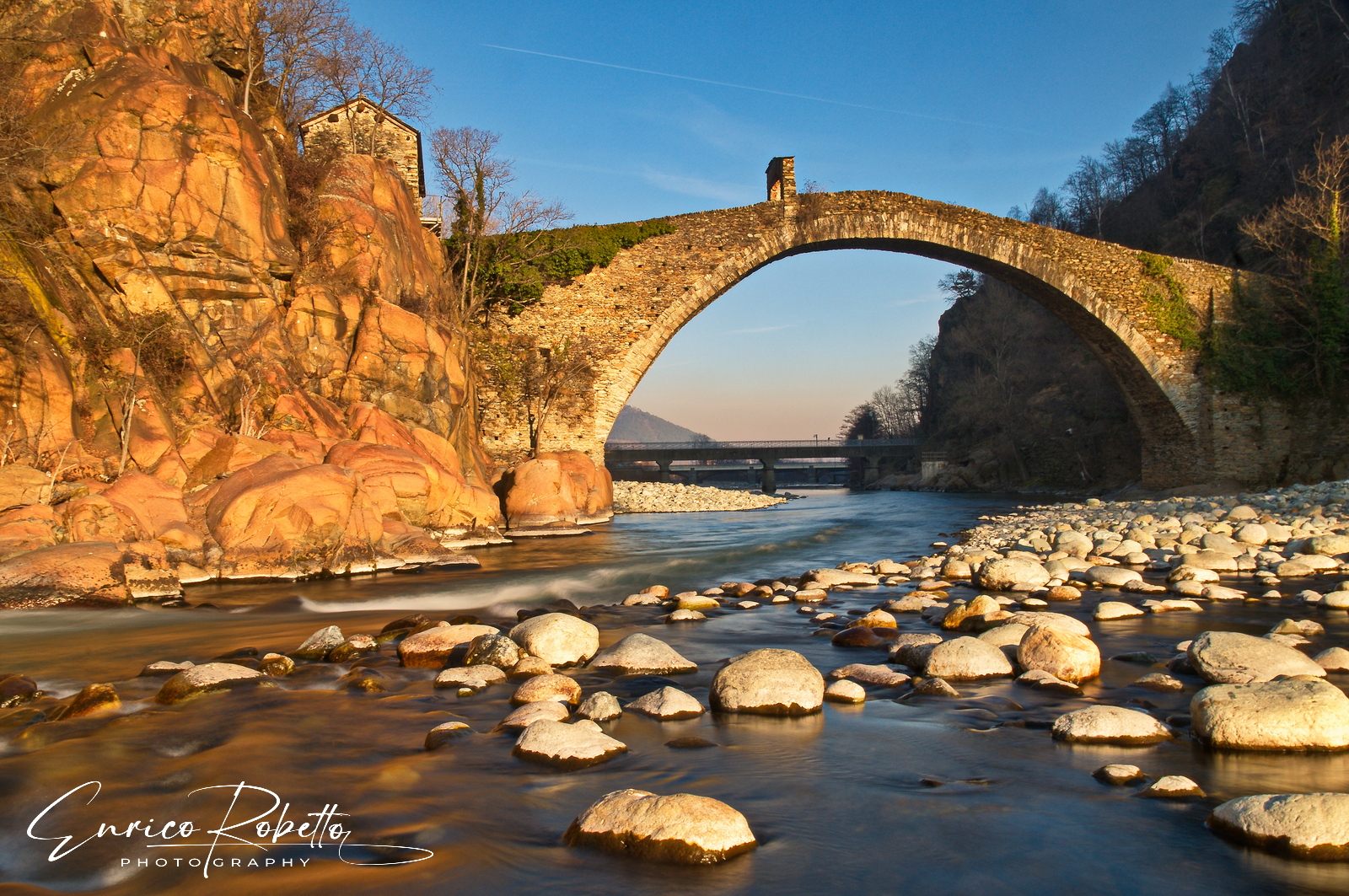 Lanzo Torinese, Parco Ponte del Diavolo, il Ponte del Diavolo al tramonto, XIV Secolo, Torino, Italia ----- Lanzo Torinese, Devil's Bridge Park, Devil's Bridge at sunset, 14th Century,Turin, Italy