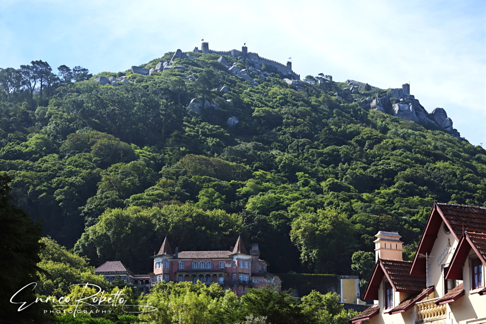 Il Palacio Valencas, XIX Secolo, in alto i muri del Castelo dos Mouros., Sintra, Lisbona, Portogallo ----- The Palacio Valencas, XIXth Century, high up the walls of the Castelo dos Mouros., Sintra, Lisbon, Portugal