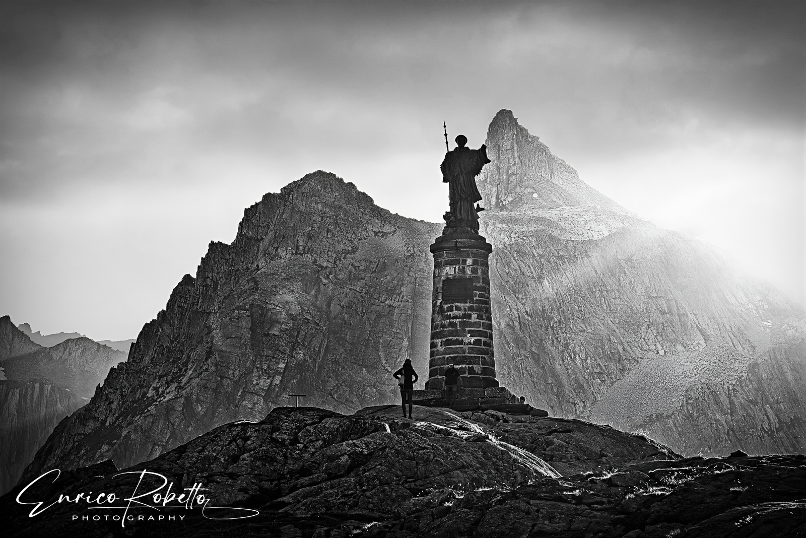 Colle del Gran San Bernardo, 2473 m. in controluce la statua di San Bernardo, Valle d'Aosta, Italia ----- Great St. Bernard Pass, 2473 m. against the light the statue of St. Bernard, Aosta Valley, Italy