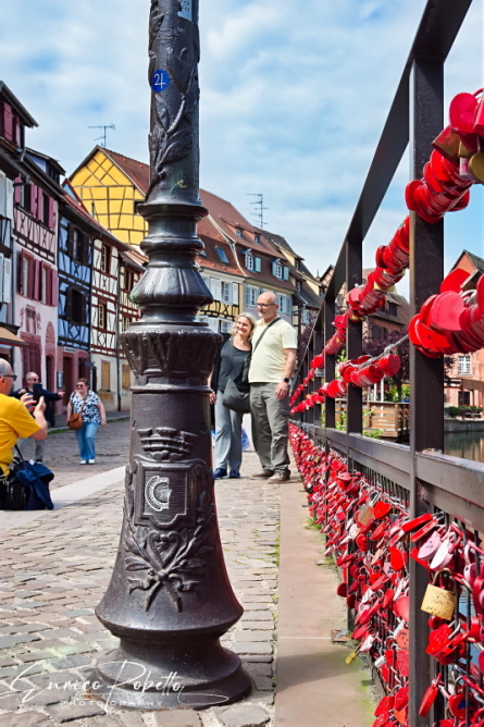Buongiorno, coppia si fa immortalare davanti a migliaia di lucchetti a forma di cuore bloccati sulla ringhiera lungo il canale Launch in Quai de la Poissonnerie, chiari messaggi di amore eterno, foto scattata durante recente tour dell'Alsazia, Colmar, Alsazia, Grand Est, Francia ----- Good morning, couple takes a picture in front of thousands of heart-shaped padlocks stuck on the railing along the Launch canal in Quai de la Poissonnerie, clear messages of eternal love, photo taken during recent tour of Alsace, Colmar, Alsace, Grand Est, France