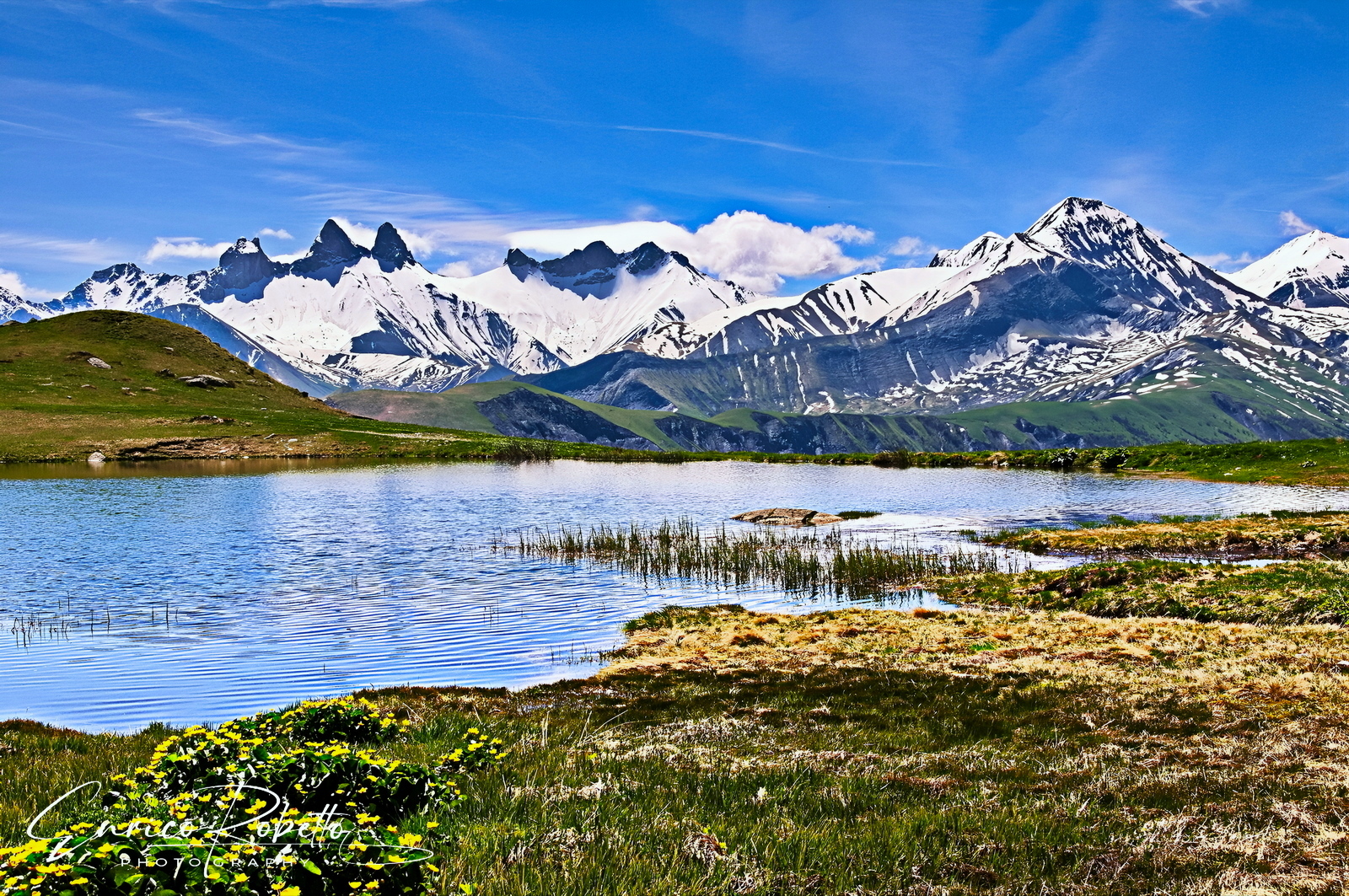Salendo verso il Col de la Croix de Fer, quì il Laghetto Le Laitelet 1990 m. sullo sfondo le Aiguilles d' Arves, 3514 m., Saint Sorlin D' Arves, Savoia, Francia ----- Going up towards the Col de la Croix de Fer, here the Laitelet lake 1990 m. in the background the Aiguilles d' Arves, 3514 m., Saint Sorlin D' Arve, Savoy, France