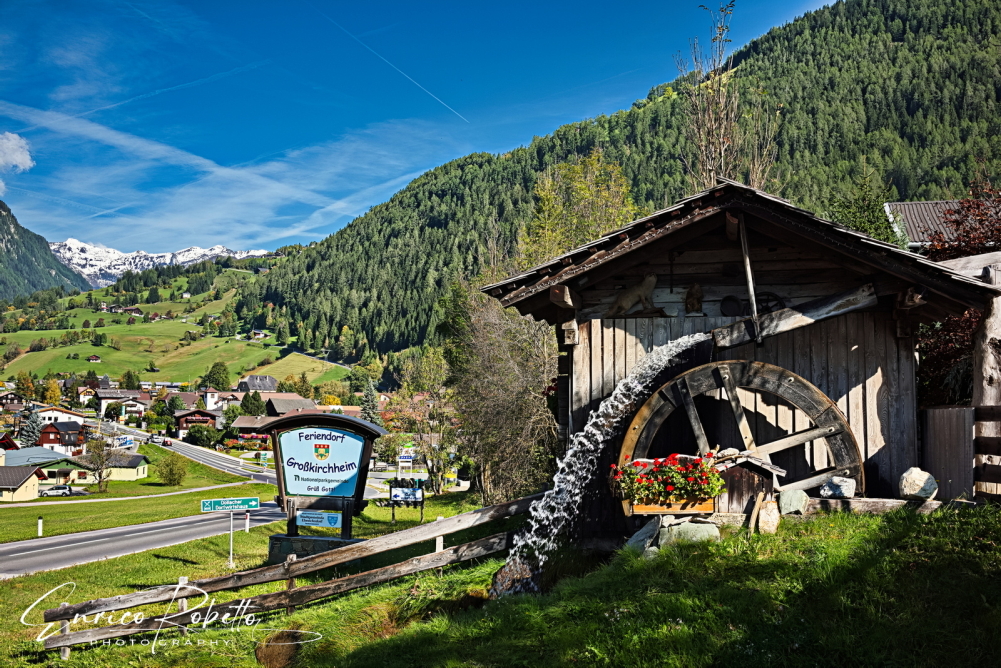 Mulino all' inizio del paese, lungo la Winklsagritz, sul fondo il massiccio del Grossglockner, 3798 m. Grobkirchheim, Carinthia, Austria ----- Mill at the beginning of the village, along the Winklsagritz, at the bottom the Grossglockner massif, 3798 m. Grobkirchheim, Carinthia, Austria