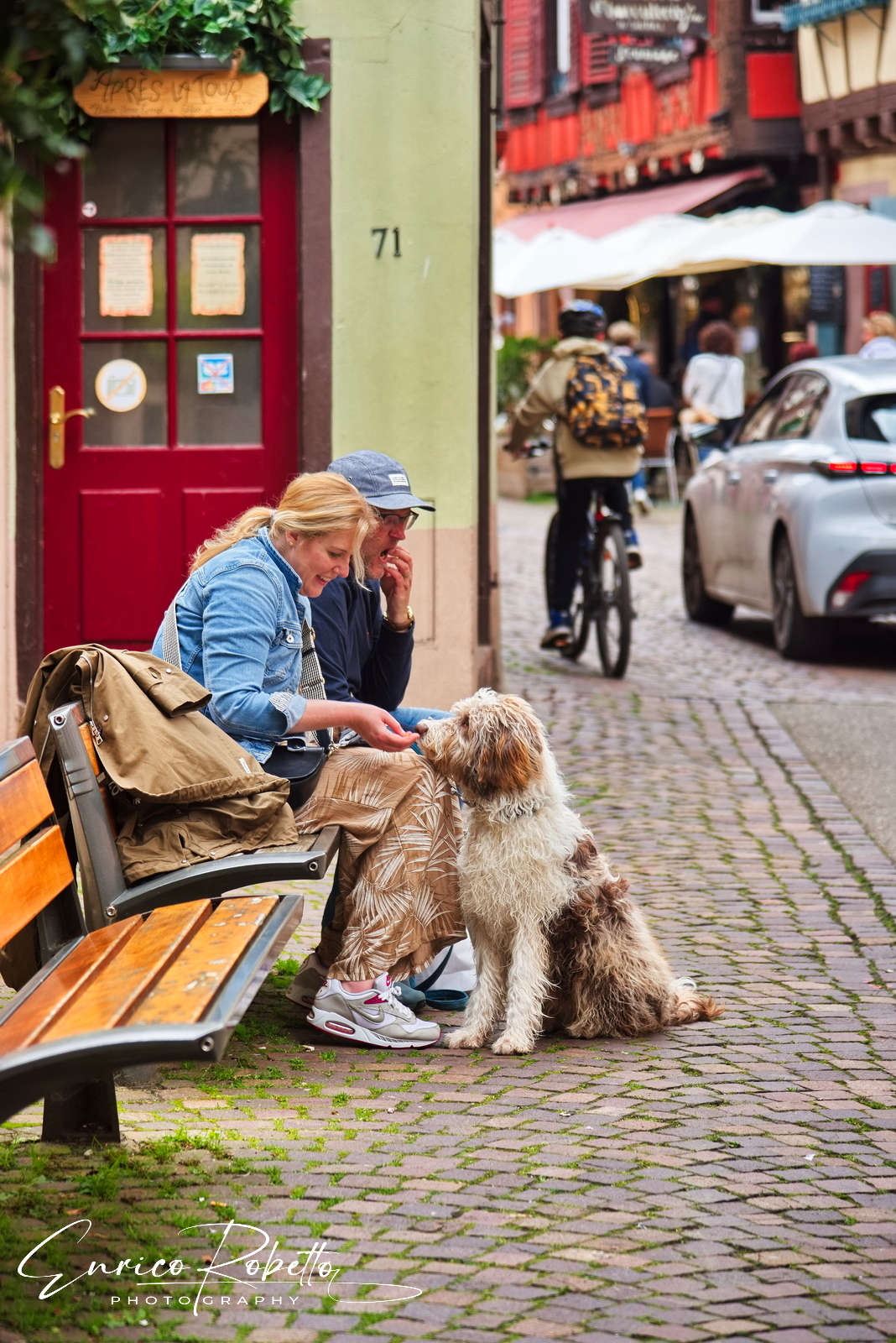 Lungo la Grad Rue, coppia seduta su una panchina con il loro amato cane, Ribeauvillé, Alto Reno, Alsazia, Francia ----- Along the Grand Rue, couple sitting on a bench with their beloved dog, Ribeauvillé, Haut-Rhin, Alsace, France