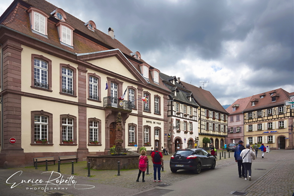 Lungo la Grand Rue, la Piazza del Municipio con la Fontana, Ribeauvillé, Alto Reno, Francia ----- Along the Grand Rue, Town Hall Square with Fountain, Ribeauvillé, Haut-Rhin, France.
