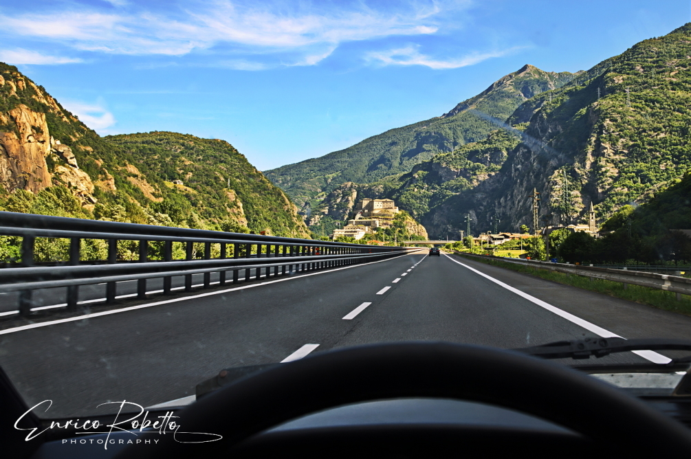 La Fortezza di Bard, XI Secolo, vista dall' autostrada TO-AO, Bard, Valle d' Aosta, Italia ----- The Fortress of Bard, XI Century, views from the highway Turin-Aosta, Bard, Aosta Valley, Italy