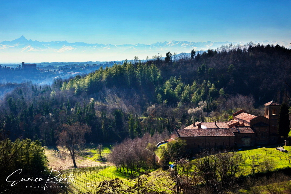 Panorama con l' Abbazia di Santa Maria di Vezzolano, VI-VII Secolo, a sinistra il Castello di Moncucco Torinese, sul fondo a sx il Monviso, 3841 m. Asti, Italia ----- Panorama with the Abbey of Santa Maria di Vezzolano, 6th-7th century, on the left the Castle of Moncucco Torinese, on the left in the background the Monviso, 3841 m. Asti, Italy
