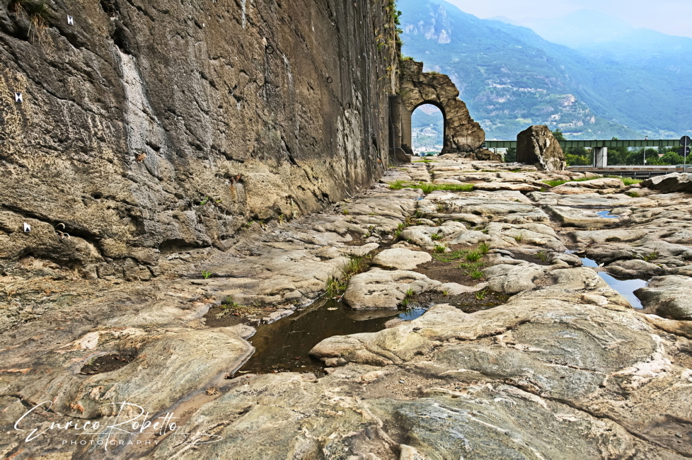 Un tratto di Strada Consolare Romana delle Gallie, 12 A.C. ben visibili sul fondo roccioso le tracce dei carri, sullo sfondo l' Arco di pietra, Donnas, Aosta, Valle d' Aosta, Italia ----- A stretch of the Roman Consular Road of Gaul, 12 BC. The tracks of carts are clearly visible on the rocky ground, with the Stone Arch in the background, Donnas, Aosta, Aosta Valley, Italy.