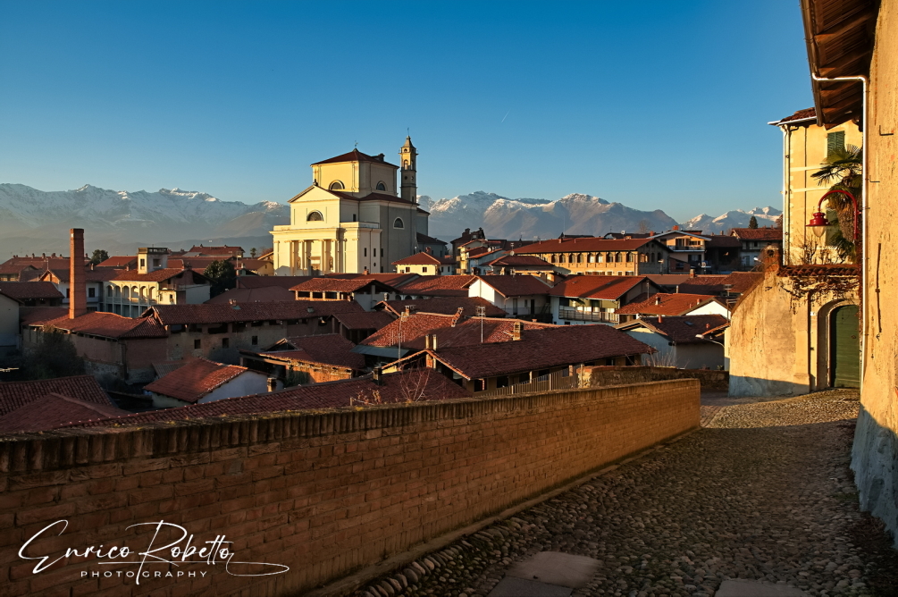 Panorama con la Chiesa Parrocchiale dei Santi Pietro e Solutore, vista dal Ricetto, Romano Canavese, Torino, Piemonte, Italia ----- Panorama with the Parish Church of Saints Peter and Solutore seen from Ricetto, Romano Canavese, Turin, Piedmont, Italy