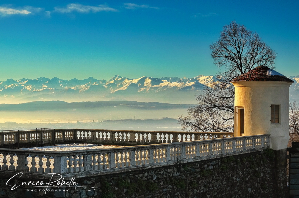 Un angolo del Castello di Masino, XI Secolo, sul fondo le Alpi Graie, Caravino, Torino, PiemonteItalia ----- A corner of the Masino Castle, 11th century, in the background the Graian Alps, Caravino, Turin, Piedmonte, Italy