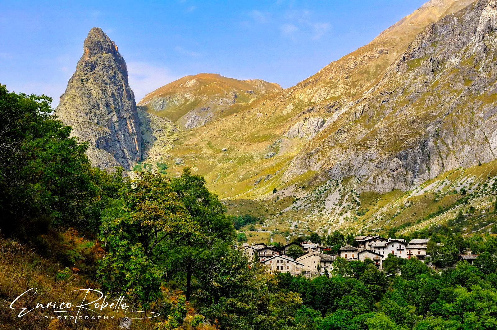 Frazione Chiappera, 1614 m. panorama con la Rocca Provenzale, 2451 m. Acceglio, Valle Maira, Cuneo, Piemonte, Italia ----- Chiappera hamlet, 1614 m. panorama with Rocca Provenzale, 2451 m. Acceglio, Valle Maira, Piemonte, Cuneo, Italy