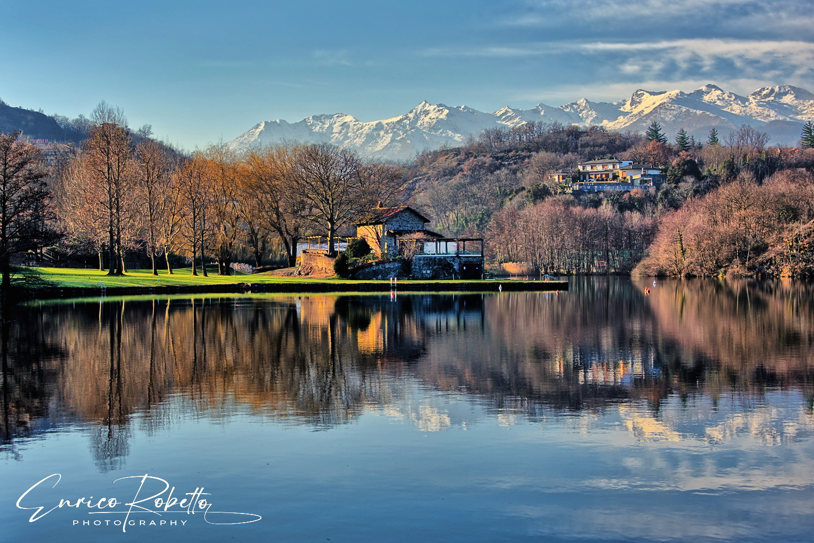 Il Lago Sirio, sul fondo le Alpi Graie, Chiaverano, Torino, Piemonte, Italia ----- Lake Sirio, with the Graian Alps in the background, Chiaverano, Turin, Piedmont, Italy