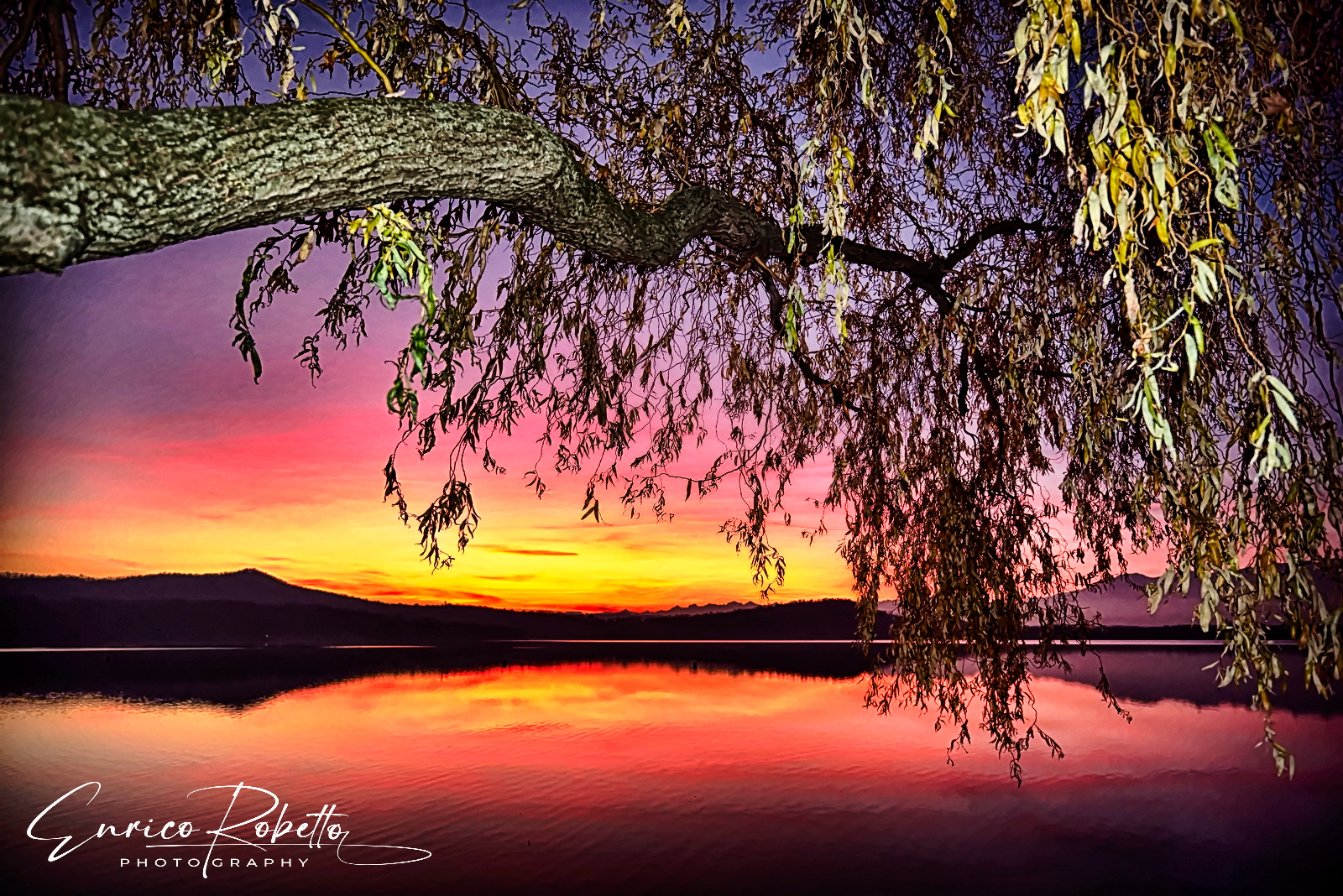 Viale Lungolago, tramonto sul Lago di Viverone, Biella, Piemonte, Italia ----- Avenue Lungolago, sunset on Lake Viverone, Biella, Piedmont, Italy