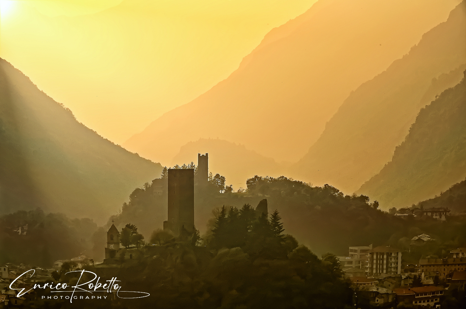 Pont Canavese al tramonto, in primo piano la Torre Ferranda, dietro la Torre Tellaria, entrambe del X-XI Secolo, Valle Orco, Torino, Piemonte, Italia ----- Pont Canavese at sunset, in the foreground the Ferranda Tower, behind the Tellaria Tower, both of the X-XI Century, Valle Orco, Turin, Piedmont, Italy