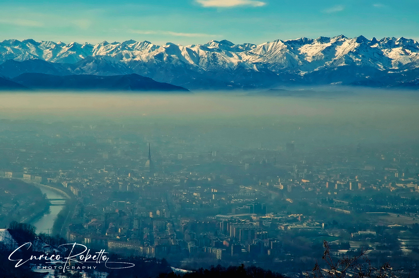 Torino e le Alpi Graie visti in una giornata nebbiosa dalla Collina di Superga, Torino, Piemonte, Italia -----Turin and the Graian Alps seen on a foggy day from the Superga Hill, Turin, Piedmont, Italy