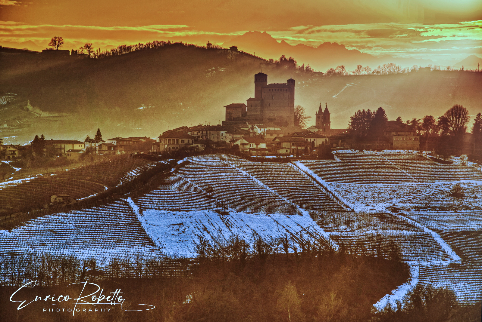 Panorama Invernale da Montelupo Albese, il Castello di Serralunga d' Alba al tramonto, Cuneo, Piemonte, Italia ----- Winter Panorama from Montelupo Albese, the Serralunga d 'Alba Castle at sunset, Cuneo, Piedmont, Italy