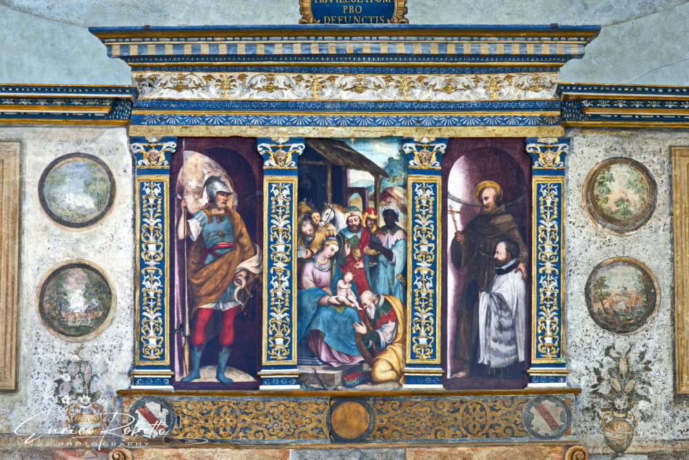San Maurizio Canavese, la Chiesa Plebana, XI Secolo, trittico dell' Altare Maggiore, da sx San Maurizio, Adorazione dei Magi e San Francesco con il donatore ----- San Maurizio Canavese, the Plebeian Church, 11th Century, triptych of the High Altar, from the left San Maurizio, Adoration of the Magi and San Francesco with the donor.