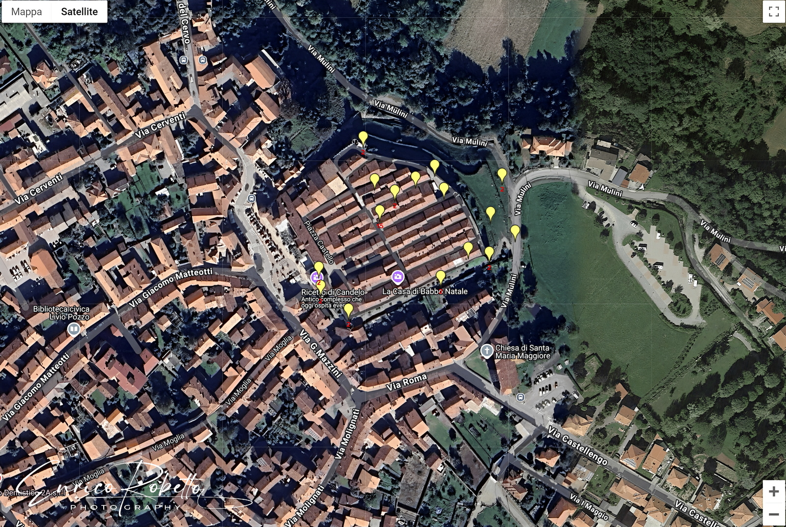 Candelo dal satellite, i punti rosso blu e gialli indicano dove ho scattato le foto ----- Candelo from Satelite, the red, blue and yellow dots indicate where I took the photos