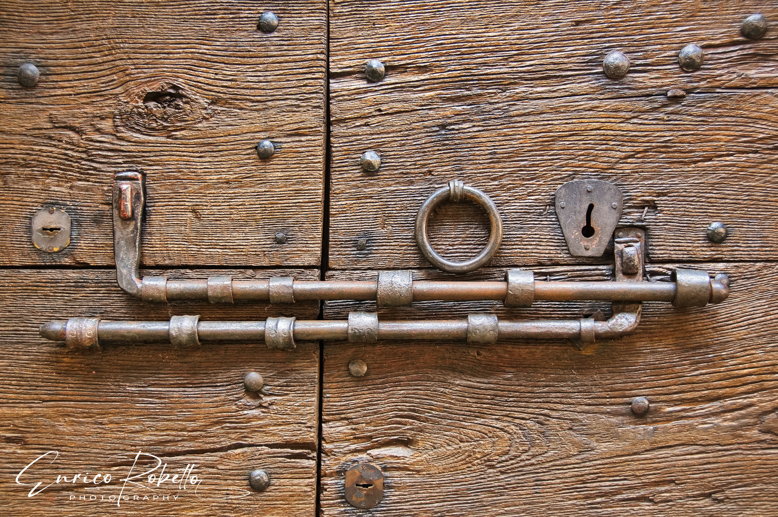 Ricetto di Candelo, XIII Secolo, doppio chiavistello sulla porta di una casa, Biella, Italia ----- Ricetto di Candelo, 13th Century, double latch on the door of a house, Biella, Italy.