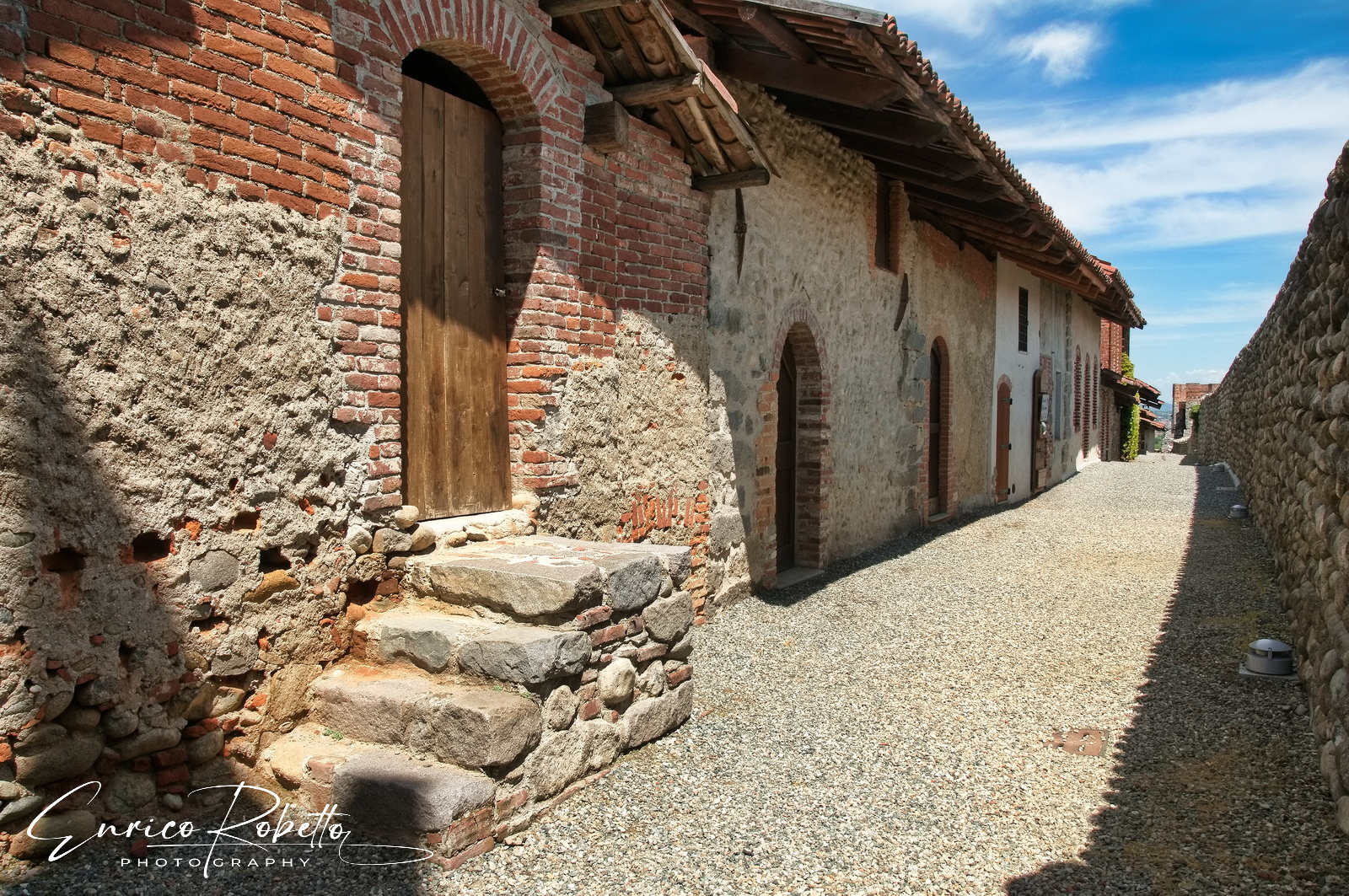Ricetto di Candelo, XIII Secolo, lungo le mura e sul fondo la Torre Sud, Biella, Italia ----- Ricetto di Candelo, 13th Century, along the walls and in the background the South Tower, Biella, Italy