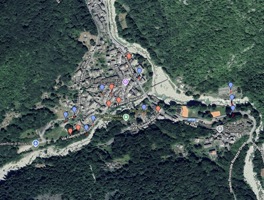 Rosazza dal satellite, i punti rosso blu e gialli indicano dove ho scattato le foto ----- Rosazza from Satelite, the red, blue and yellow dots indicate where I took the photos
