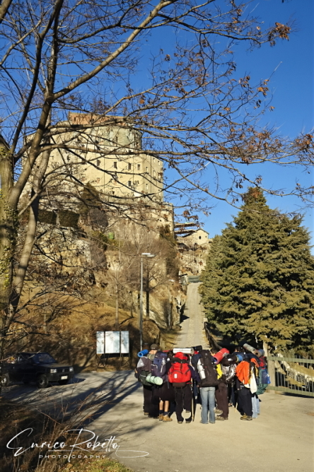 Abbazia di San Michele, X Secolo, in primo piano un gruppo di esploratori, Chiusa San Michele, Torino, Piemonte, Italia ----- Abbey of San Michele, 10th century, in the foreground a group of scouts, Chiusa San Michele, Turin, Piedmont, Italy