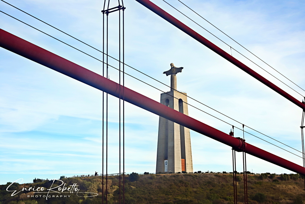 Attraversando il Ponde 25 de Abril, sul fondo il Santuario Nacional de Cristo Rei, XIX Secolo, Lisbona, Portogallo ----- Crossing the 25 de Abril Bridge, at the bottom is the Santuario Nacional de Cristo Rei, XIX Century, Lisbon, Portugal