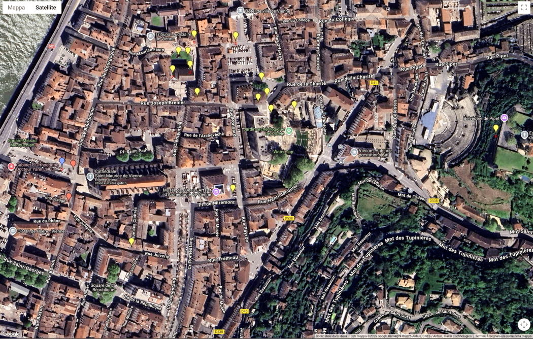 Vienne dal satellite, i punti rosso blu e gialli indicano dove ho scattato le foto ----- Vienne from Satelite, the red, blue and yellow dots indicate where I took the photos