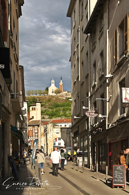 Lungo Rue Joseph Brenier, sullo sfondo la Chapelle de Notre Dame de la Salette, Vienne, Francia ----- Along Rue Joseph Brenier, in the background the Chapelle de Notre Dame de la Salette, Vienne, France