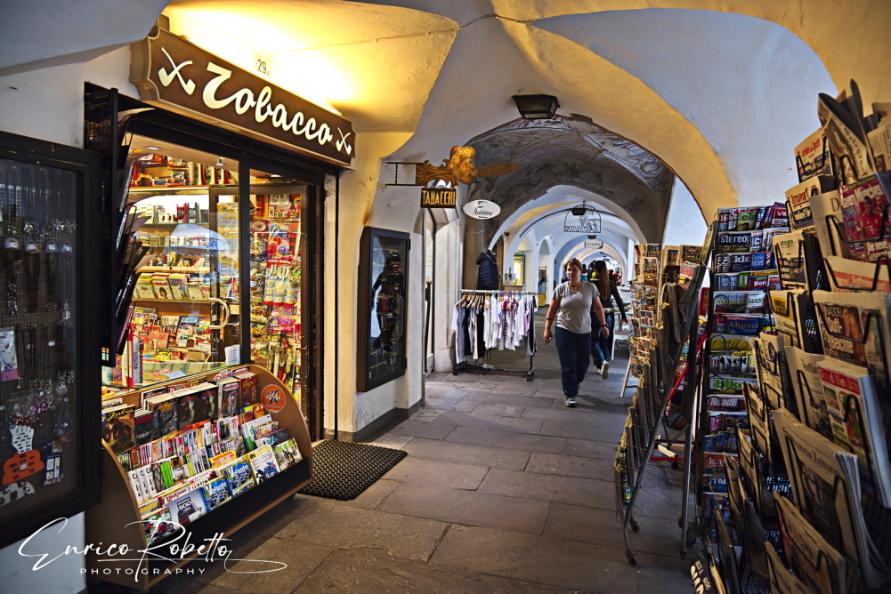 Portici lungo Via Città Nuova, Vipiteno, Bolzano, Italia ----- Arcades along Città Nuova Street, Vipiteno, Bolzano, Italy